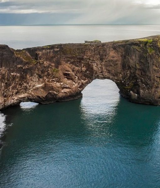 From the clifftop viewpoints, the coastline unfolds in long black sand beaches, distant glaciers, and rolling ocean swells that never seem to repeat themselves. The massive stone arch, carved by centuries of erosion, frames the sea below and gives the area its name. Far beneath the cliffs, waves strike the shore in steady rhythm, emphasizing the scale and openness of the landscape.