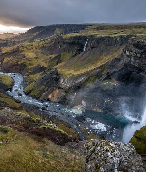 Granni is defined by restraint. Flowing quietly beside the much larger Gullfoss, this narrow waterfall follows the same river yet expresses it in an entirely different way. Where Gullfoss overwhelms with scale and sound, Granni moves with focus and precision, carving a clean line through the rock.