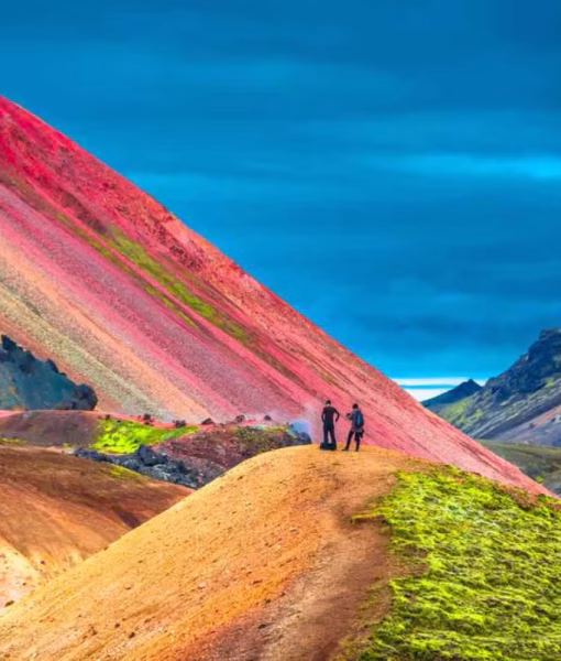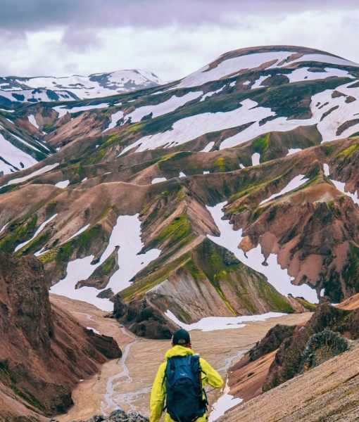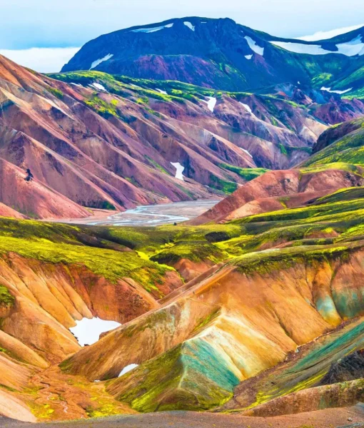 Landmannalaugar feels unreal in the most literal sense. Color dominates the landscape — soft reds, pale greens, warm yellows, and dark lava tones layered across rolling rhyolite mountains. Nothing here settles into a single shade, and the terrain seems to shift visually as clouds pass and light changes.
